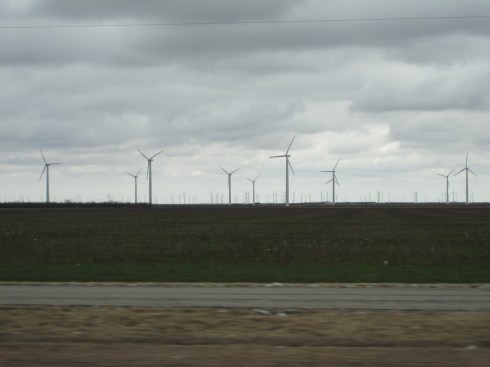 - T. Boone Pickens–or someone similarly inclined–has covered a large portion of central Texas with wind turbines. For miles, you see them perched on the mesas and lined up across the cotton fields. Hundreds of them in every direction. Almost makes you feel like aliens have invaded. Eerie, but very ecologically minded. Brownie points–I mean, Greenie Points–for Texas.
