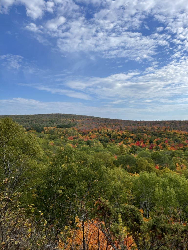 Besides the breathtaking water views, we’ve been treated to eye-popping fall colors since driving into northern Wisconsin two days ago. Still, being gluttons for fall colors, we decided to drive across Brockway Mountain Drive, which meanders across the ridge of the mountains that run parallel to the shore between Eagle Harbor and Copper Harbor. The road was rough, but the views down into the valley to the south and out across Lake Superior to the north did not disappoint. Here’s one of our favorites of the valley: