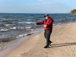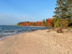 Oh, and we kicked the whole leaf-peeping tour with a stop at the small but lovely roadside park right by the house that has a sand beach. Sand beaches aren’t rare in the UP; they’re just the exception rather than the rule. At least in this part of the state. It was fun to be able to walk out close to the water without having to balance on slick boulders. Not that we’ve let the boulders stop us completely. We aren’t that old and wimpy! Tom even found a few flat rocks to skip into the waves. He’s still got it! I would tell you how many times he got the rock to skip, but he’s a humble man.