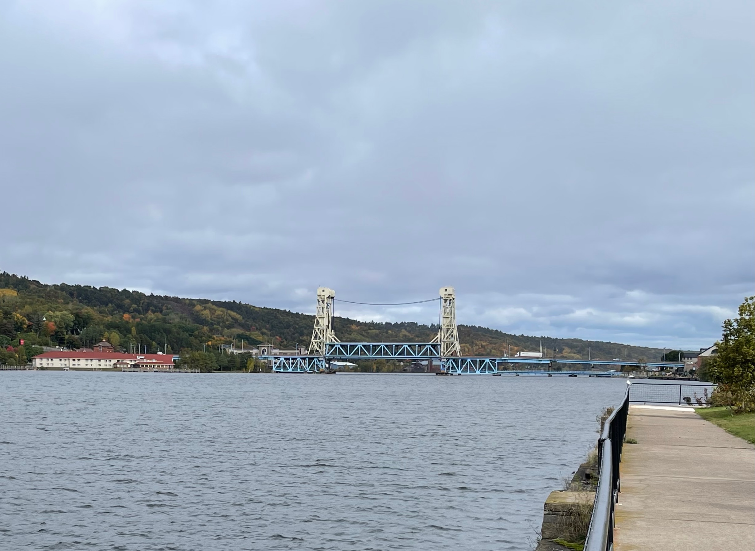 Our drive today ended in Houghton, MI, the home of Michigan Technological University (MTU). MTU is a beautiful campus with over 7,000 students (most of them studying engineering) who happen to be celebrating Parents’ Weekend, Homecoming, and the 100th anniversary of the founding of the school this weekend. We were just finishing our lunch at a restaurant called The Library in downtown Houghton (I highly recommend the Creamy Swiss Au Gratin soup) when things took a serendipitous turn. Besides the food, we had enjoyed looking out their large windows which face the Keweenaw Waterway (essentially a river that bisects the peninsula and connects Lake Superior on the east of the peninsula to Lake Superior on the west). The view was like something out of a picture book or movie. We could see fall colors on the opposite bank, the historic Portage Lake Lift Bridge, and the handsome, newly renovated walkway along the waterway. An occasional boat floated passed; and at one point, a float plane took off. There hadn’t been many people out and about for us to watch, but that was about to change. Just as we finished paying the bill, we saw a cardboard boat, hoisted over the heads of about eight to ten young men, pass by on the street below headed toward the bridge. Hmmm. Cardboard boat…engineering students…a river…40-degree temperatures. Dang. This was promising. The waiter confirmed that there was a boat race scheduled to take place at the park on the other side of the bridge in an hour or so as part of the homecoming festivities which was all we needed to hear. We had our coats (and hats and gloves) on in nothing flat and headed out the door in hot pursuit.